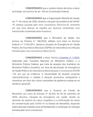 Em Recomendação destinada a todos os Municípios maranhenses, Policia Militar, Polícia Civil e realizadores de festas, o Ministério Público do Maranhão recomendou a observação imediata de normas e condutas para evitar a proliferação da Covid-19 durante o período do caranval, bem como enquanto perdurar a pandemia. O documento foi assinado pelo procurador-geral de justiça, Eduardo Nicolau, no dia 18 de janeiro.
